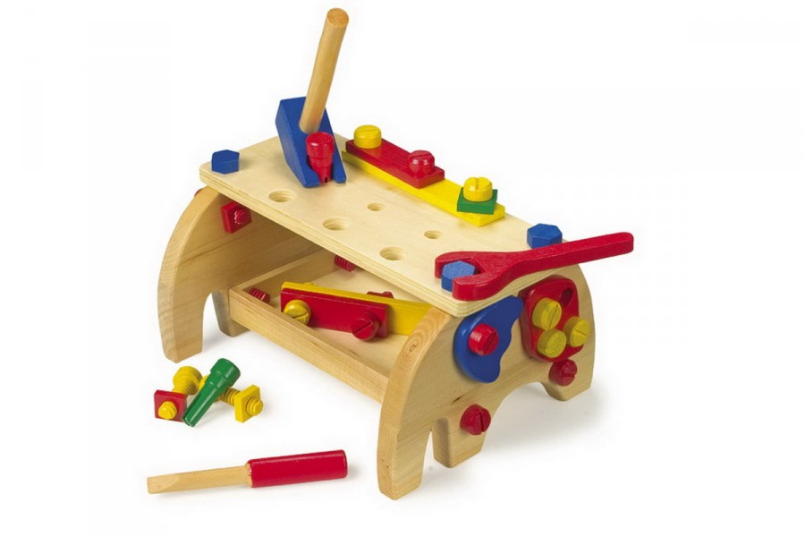 Dřevěný pracovní stůl je vyroben z kvalitního dřeva, některé části jsou barevně lakovány. Dítě může šroubovat, zatloukat hřebíky a pak je vytahovat. Umožněte svému dítěti rozvíjet fantazii a jemnou motoriku.