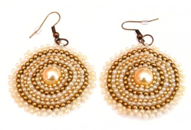 Náušnice šité z rokajlových korálků smetanové a zlaté barvy.