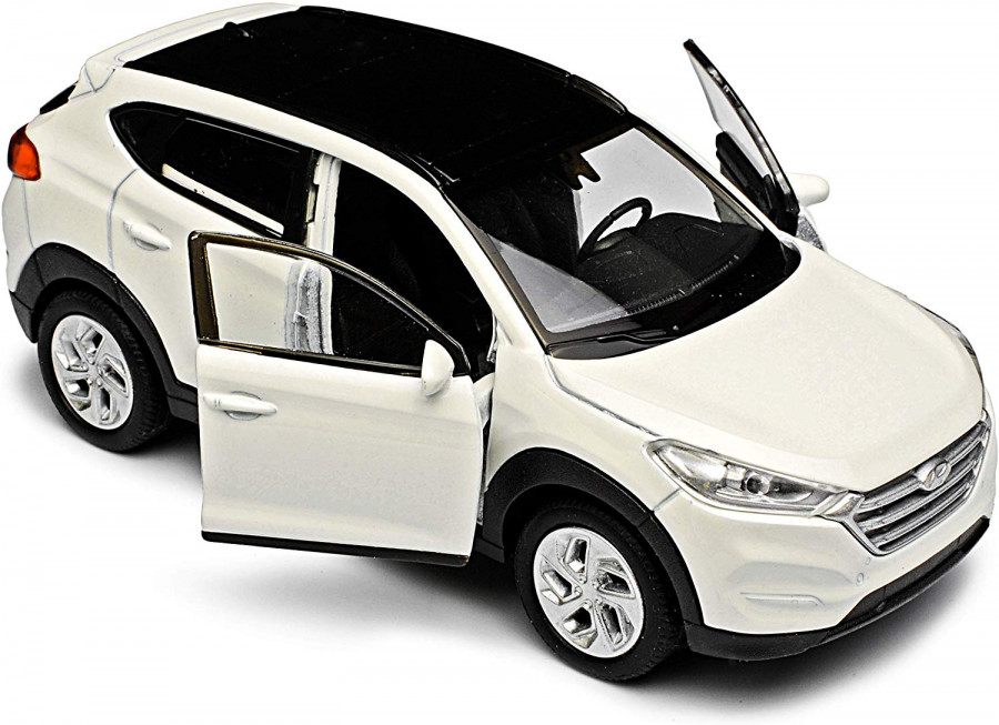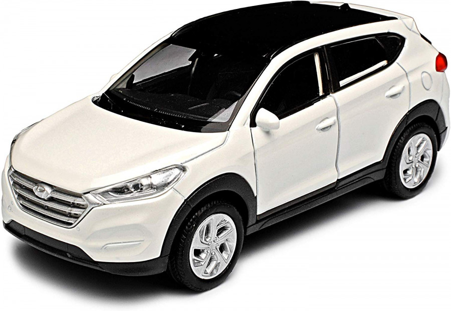 Autíčko Hyundai Tucson TL bílé barvy v měřítku 1:34/39 značky Welly s plastovým podvozkem a kovovou karoserií.