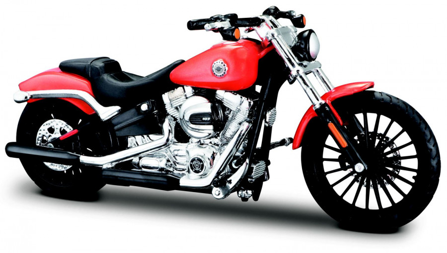 Model motorky Harley Davidson Breakout (2016)v měřítku 1/18, značky Maisto. Motorka má na délku cca. 13,5 cm a šířku cca. 5 cm (včetně řídítek).