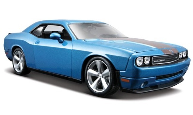 Kovový model auta Dodge Challenger SRT8 (2008) v modré barvě je měřítku 1:24. Model má kovové osy kol a detailní zpracování karoserie i doplňky uvnitř vozu. Na modelu se otvírá přední kapota a dveře.
