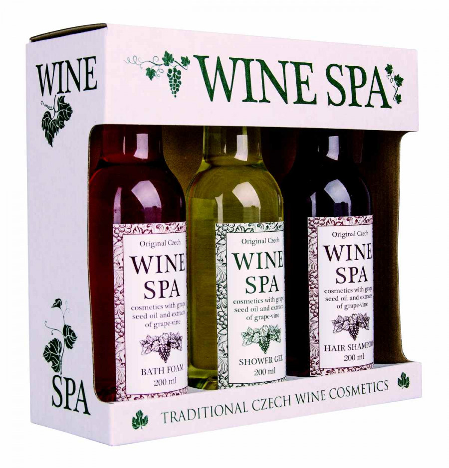 Dárkové balení kosmetiky kosmetika Wine Spa obsahuje vinný sprchový gel 200 ml. a vinný vlasový šampon 200 ml. a vinná koupelová pěna 200 ml.(Wine Spa) obsahující vinný extrakt a hroznový olej přináší velmi blahodárné účinky na pokožku.