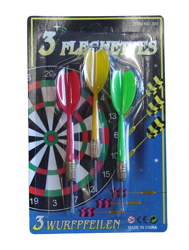 Šipky s kovovým hrotem v sadě na kartě v počtu 3 ks. Šipky mají plastové tělo.