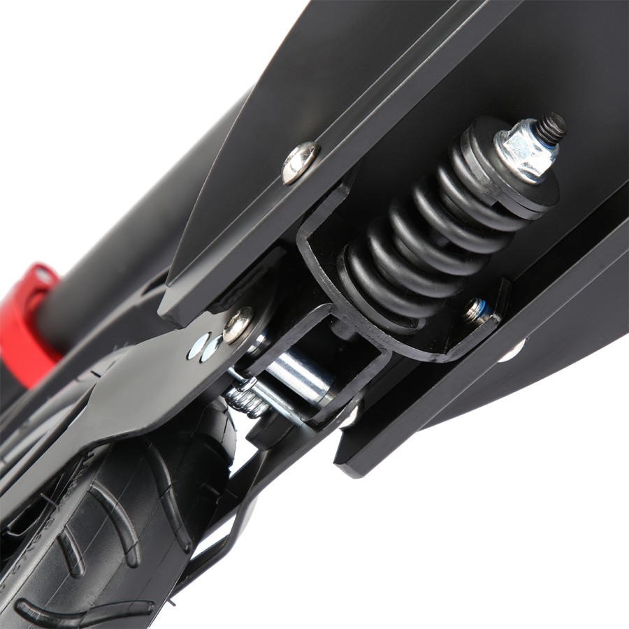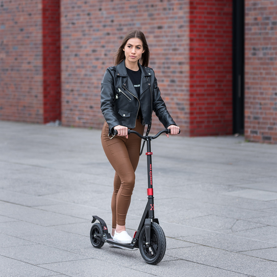 Pumpovaná kola jsou ideální pro dlážděné chodníky, pneumatika se přizpůsobí podkladu a i jízda po takzvaných "kočičích hlavách" bude příjemná a tichá. 20-ti centimetrové zadní kolo je osazeno vodorovným tlumičem, které tak má téměř stejný účinek tlumení, jako 30-ti centimetrové přední kolo. Jako brzda slouží robustní, hliníkový blatník, který stačí pouze přišlápnout a koloběžka začne okamžitě zpomalovat.