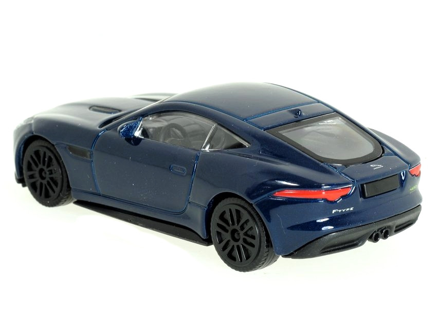 Kovový model auta Bburago Jaguar F Type R v modré barvě a měřítku 1 : 43. Autíčko je vyrobeno z kovu, má kovové osy kol a plastový podvozek.