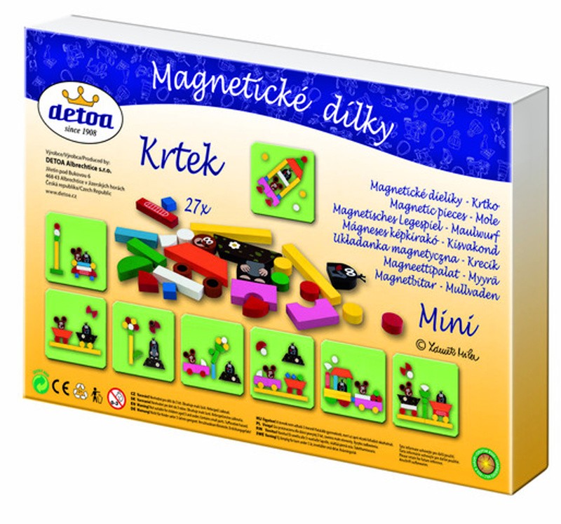 Magnetické puzzle obsahují magnetickou tabulku se stojánkem a 27 dřevěných dílků s magnetem z nichž lze sestavit různé obrázky.