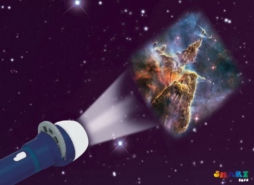 Dětská svítilna a ruční foto-projektor s 24 perfektně ostrými snímky z NASA, které promítá na zeď nebo strop pokojíčku. Snímky jsouuloženy na třech ktoučích po 8 kusech.