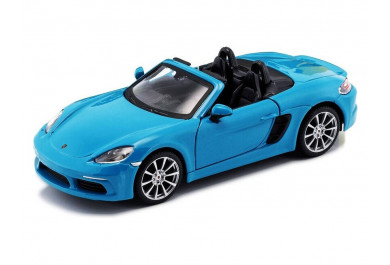 Kovový model auta Bburago Porsche 718 Boxster Blue. Model otvírá dveře a zadní kapotu, zatáčecí kola, kovovou karoserii s plastovým podvozkem a doplňky.