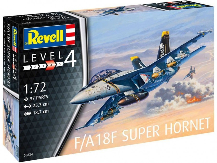 Revell Modelkit letadla 03834 F/A18F Super Hornet je stavebnice určená ke slepení v měřítku 1:72. Stavebnice obsahuje 97 dílků. Sestavený model má na délku 25,4 cm.