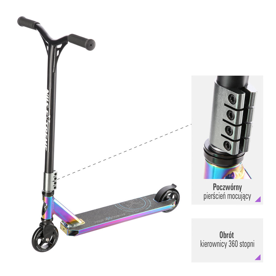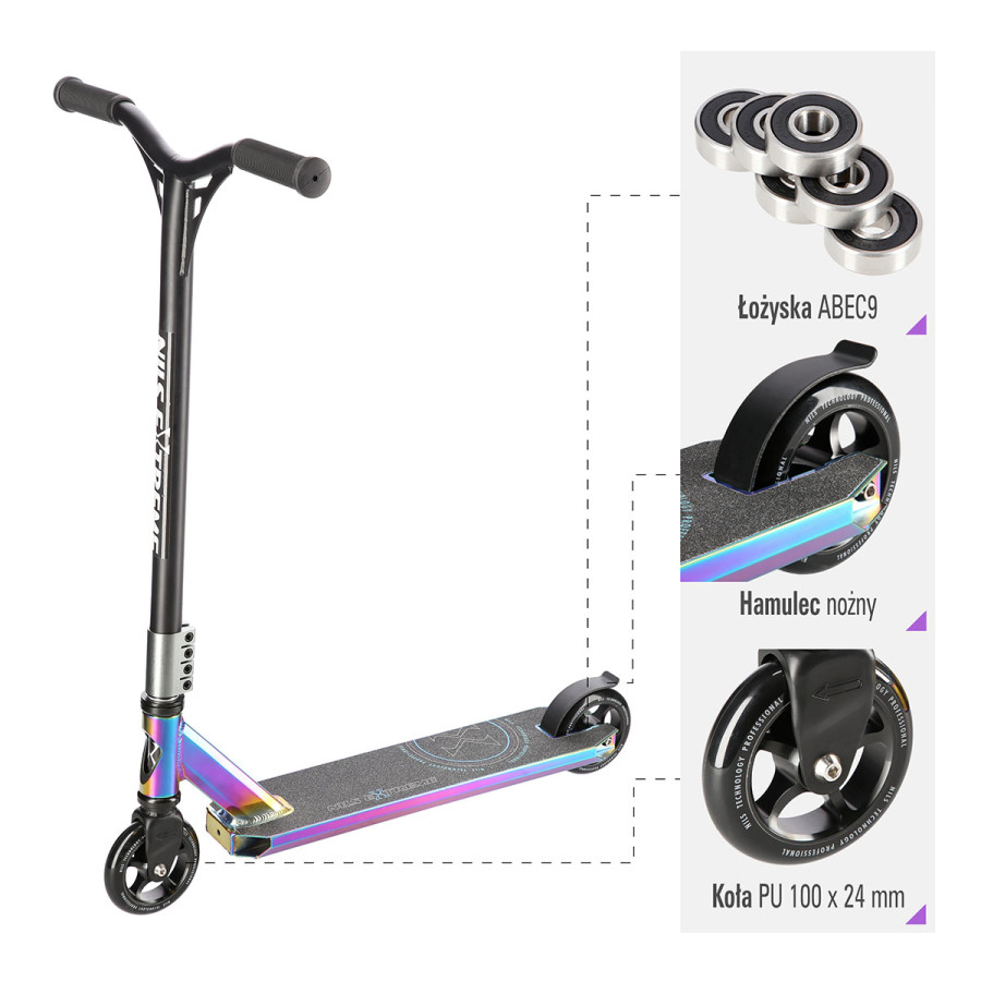 NILS Extreme HS109 je freestyle koloběžka s nosností 100 kg a je tak vhodná jak pro děti, tak pro dospělé. Konstrukce je vyrobena ze silné a trvanlivé oceli. Model HS109 je vhodný na asfalt a dlažbu. Kolečka o rozměru 100 x 24 mm jsou osazena ložisky ABEC 9, bezpečnost zaručuje zadní přítlačná (blatník) brzda. NILS Extreme HS109 je díky malým, rychlým kolečkům, robustní, pevné kostrukci a řídítkům protáčejícím se o 360° určena k provádění triků.