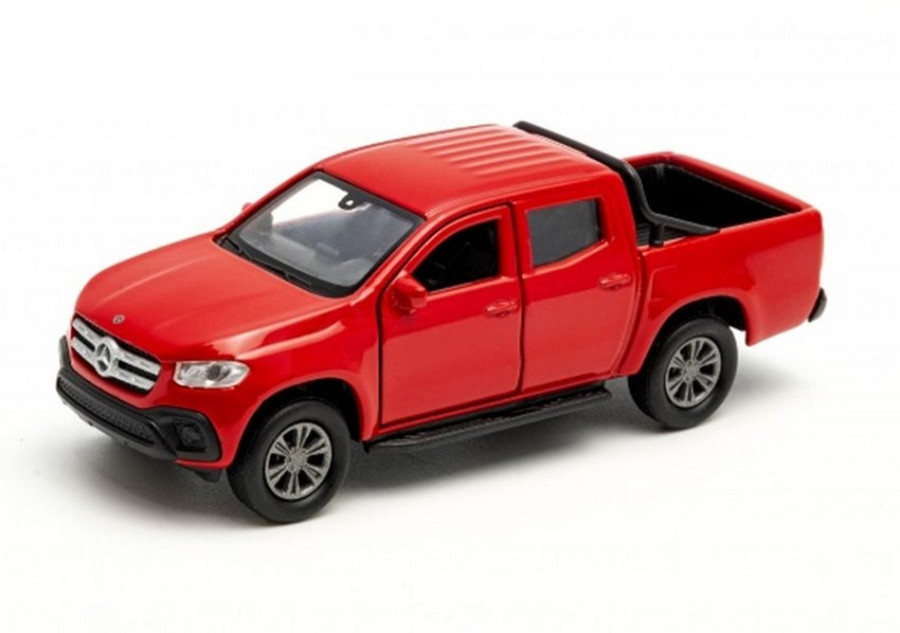 Autíčko Mercedes Benz X-Class červené barvy v měřítku 1:34-39 značky Welly vyrobené z kovu a plastu. Model autíčka má kovové osy kol a detailní zpracování karoserie včetně interiéru automobilu. Na modelu se otvírají přední dveře.