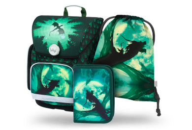 Školní aktovka Ergo Drak s vyztuženým tělem, vhodná od 1. třídy ZŠ v sadě s penálem a sáčkem.