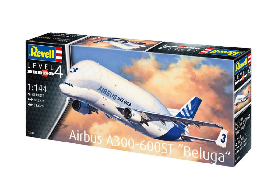Revell ModelKitt letadlo 03817 Airbus A300-600ST Beluga je plastová stavebnice určena ke slepení v měřítku 1:144. Stavebnice obsahuje 78 dílků ke slepení modelu dlouhého 38,2 cm.