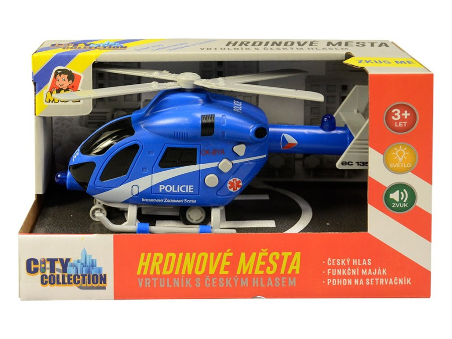 Modrý policejní vrtulník v českém designu s českým hlasem. Vytvořte si doma svůj vlastní heliport se záchranným vrtulníkem od českého výrobce MaDe.