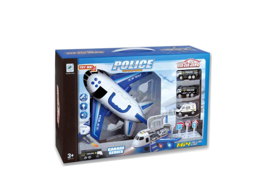 Hrací set se světelným a zvukovým efektem. Součástí balení jsou 3 kovová autíčka 1:64 na setrvačník. Otvírací nákladní prostor na letadle. Letadlo je lehce přenosné díky své rukojeti, schody z letadla se mohou vyklopit.