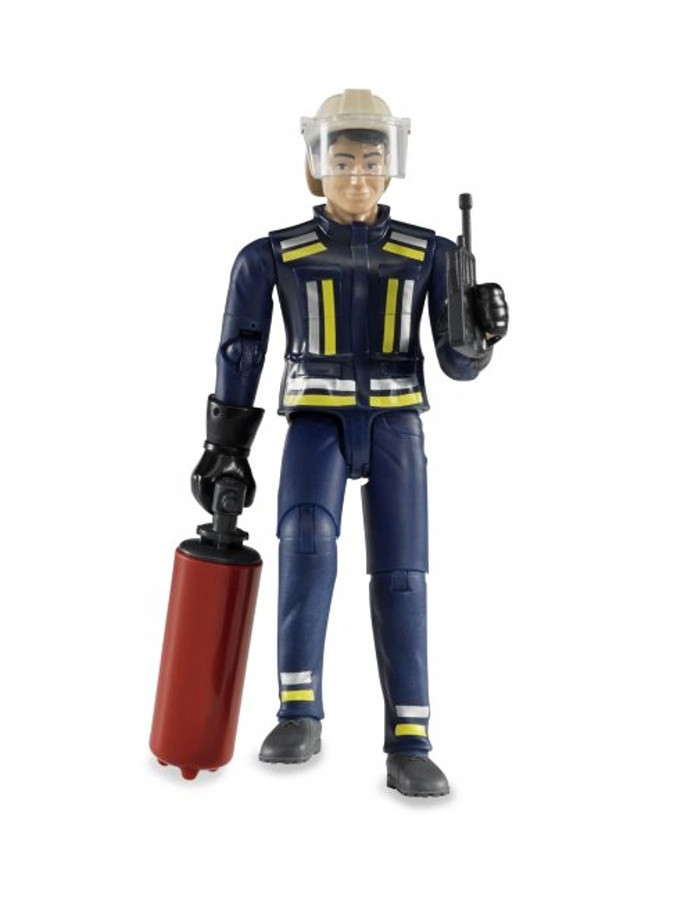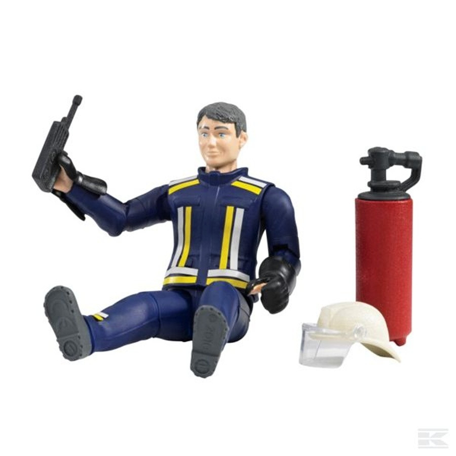 Hasič Bruder 60100 s helmou, rukavicemi, hasícím přístrojem a vysílačkou. Figurka má pohyblivé dolní i horní končetiny včetně hlavy.