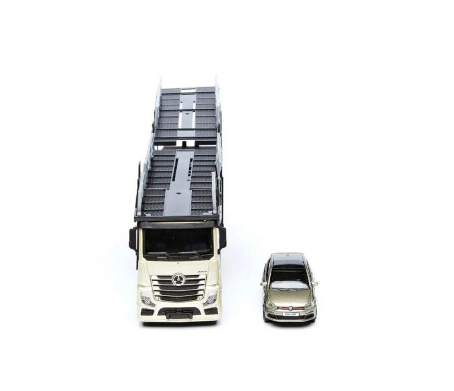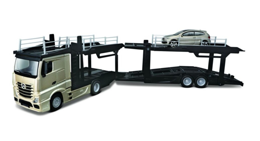 Mercedes Benz Actros je nákladní auto s návěsem na převoz aut a model autíčka VW Polo GTI značky Bburago. Nákladní auto s návěsem má na délku včetně vleku cca. 45 cm , výšku cca. 10 cm a šiřka cca. 6 cm (bez bočních zrcátek).