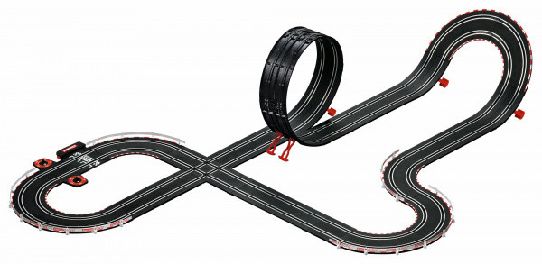 Autodráha Carrera GO!!! dlouhá 6,3m s auty BMW M4 GT3 a Audi R8 LMS GT3 obsahuje looping, křižovatku, rovinky, zatáčky, kolmou stěnu, díl s počítadlem kol a další díly. Můžete si sestavit další různé trati podle své fantazie.