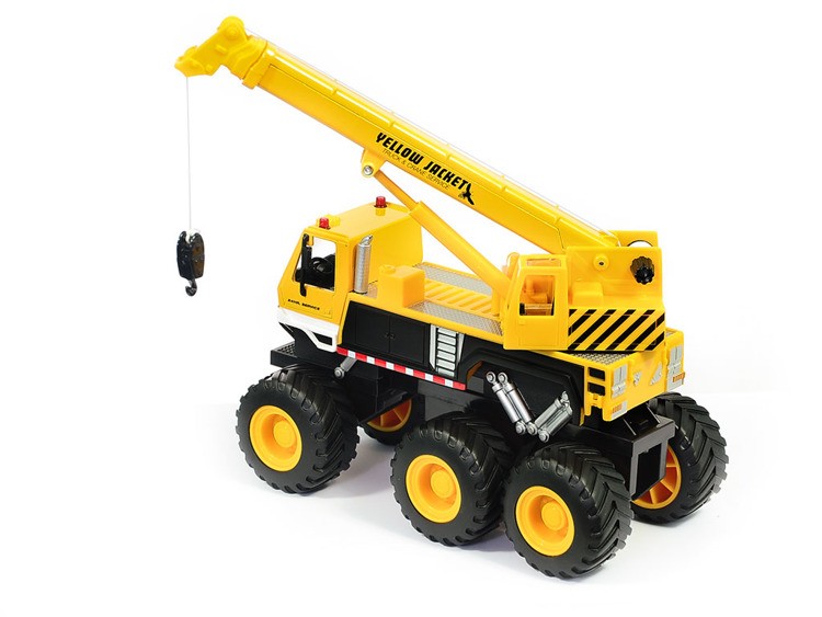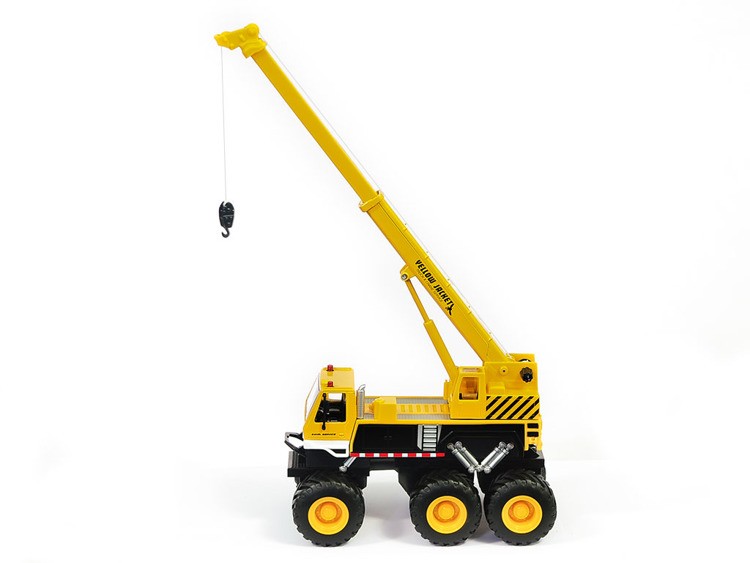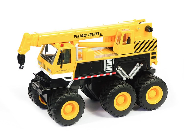 Velmi kvalitní dětské autíčko s kovovou kabinou a plastovým podvozkem s detaily. Jeřáb má gumové off-road pneumatiky a 2 třecími motory u přední a zadní nápravy. Délka modelu je cca. 20 cm. Jeřáb má otočnou věž a výsuvné rameno. Autíčko nepotřebuje žádné baterie.