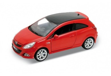 Autíčko Opel Corsa OPC červené barvy v měřítku 1:34/39 značky Welly s plastovým podvozkem a kovovou karoserií.