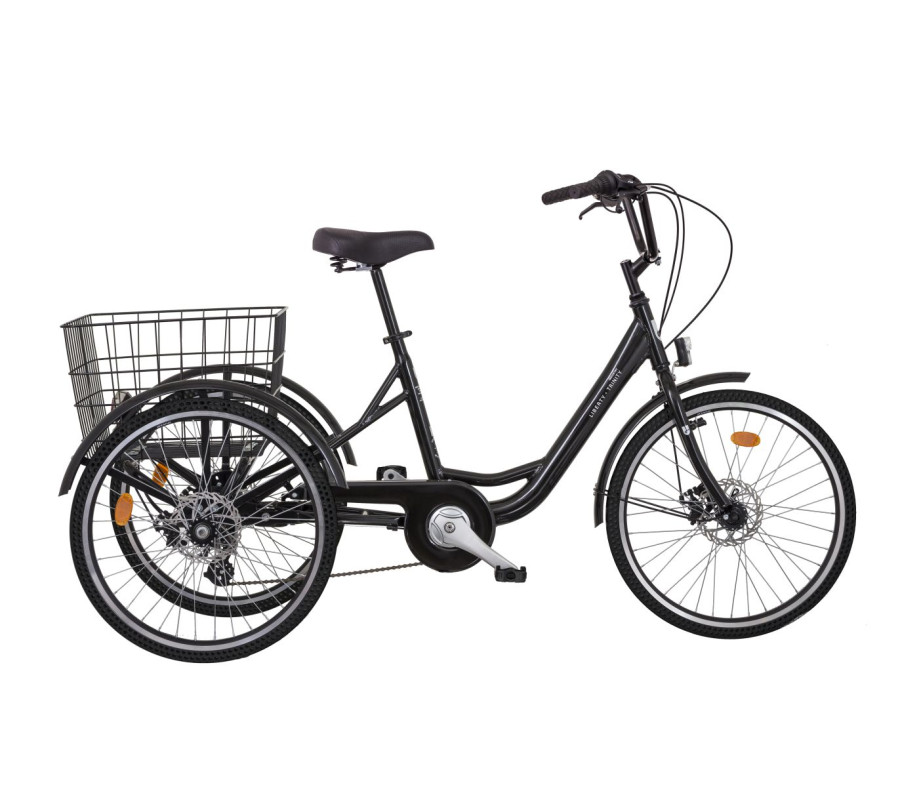 Trojkolka Liberty Trinity 6spd. Disk je postavená na hliníkovém rámu o velikosti 18", který má nízkou úroveň spodní trubky (340 mm). Tříkolka je vybavena zadním 6 stupňovým měničem a diskovými brzdami na všech třech kolech.