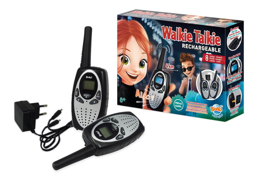 BUKI Walkie Talkie jsou dětské vysilačky s vlastnostmi reálných vysílaček pro dospělé. Hlavní výhodou této hračky je skutečná dosah v otevřeném terénu až 4km a jednoduchost použití pro menší děti.
