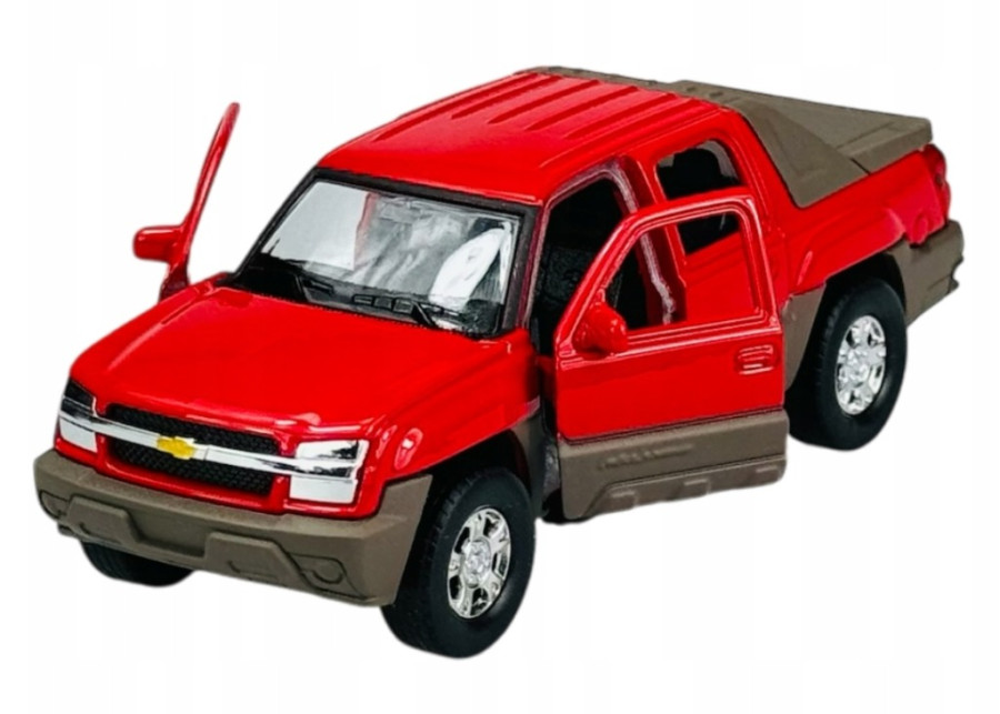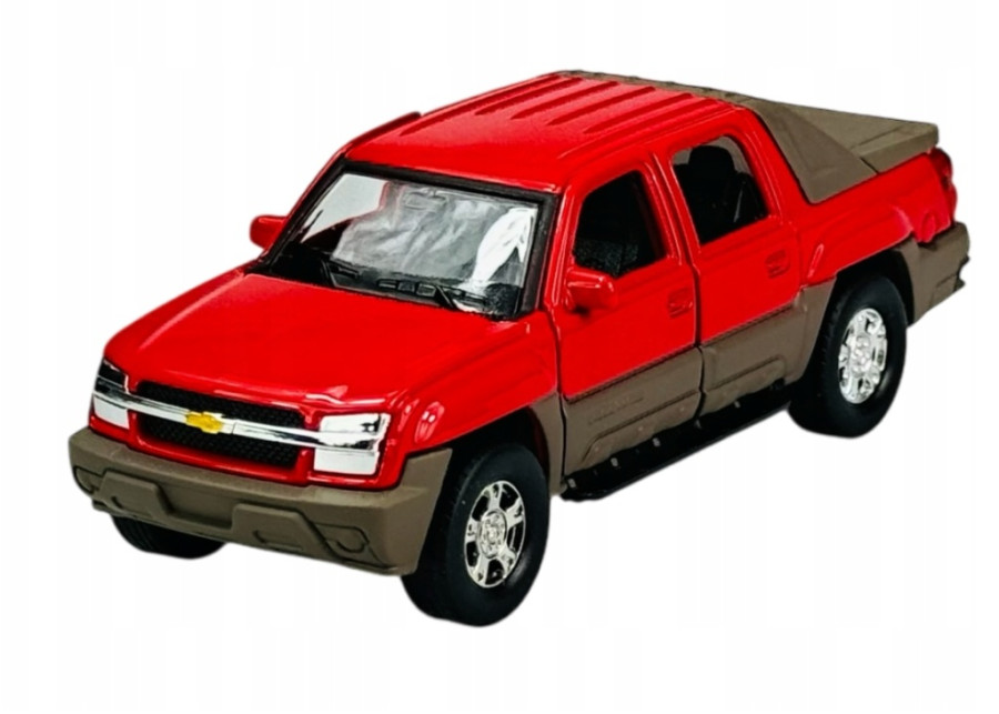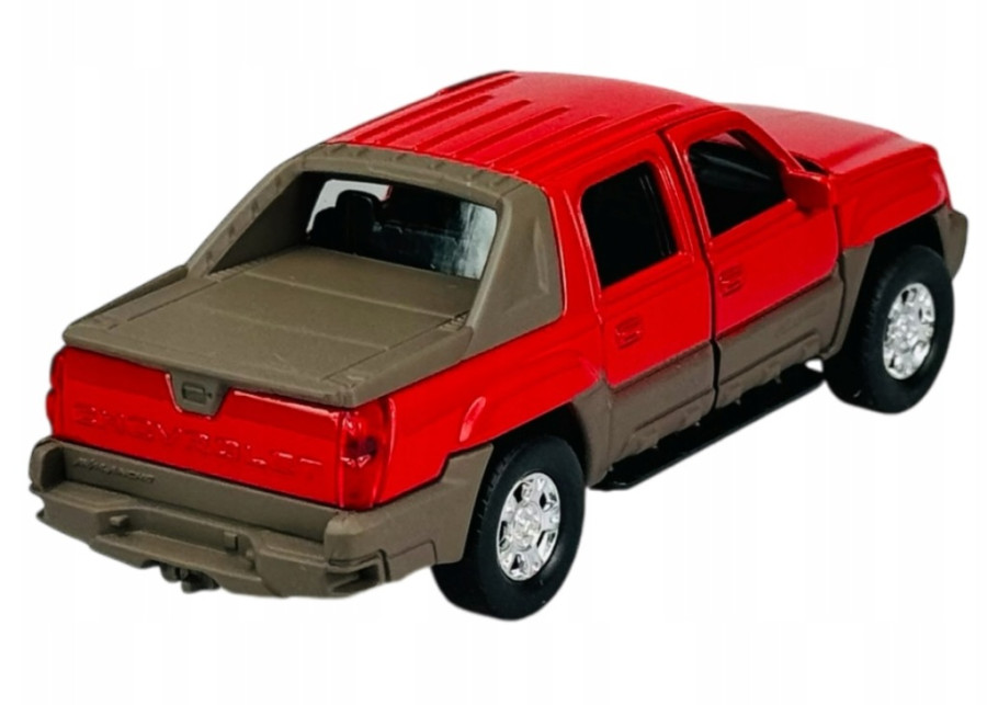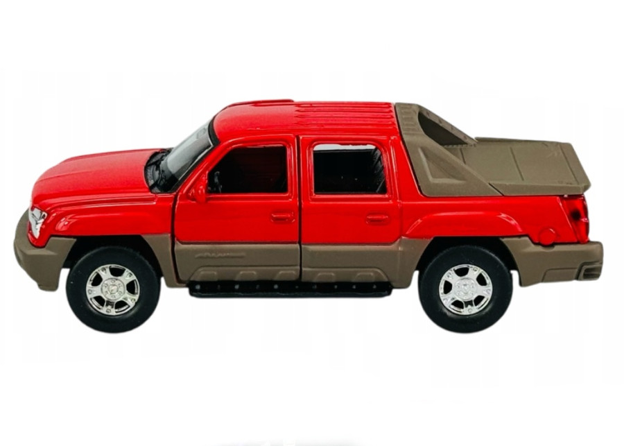 Autíčko Chevrolet ´02 Avalanche v červené barvě v měřítku 1:34-39 značky Welly s plastovým podvozkem a kovovou karoserií.