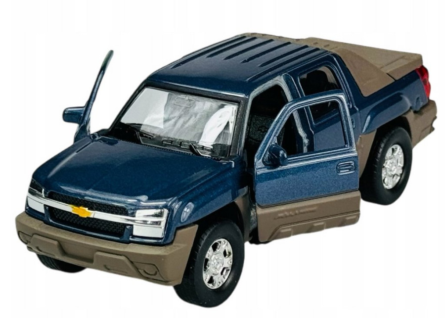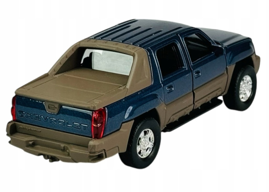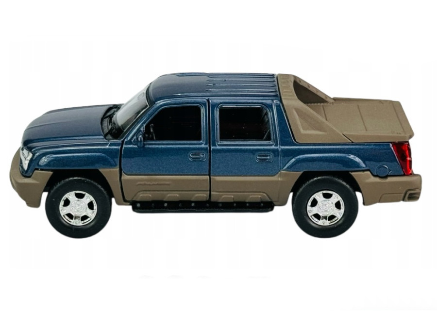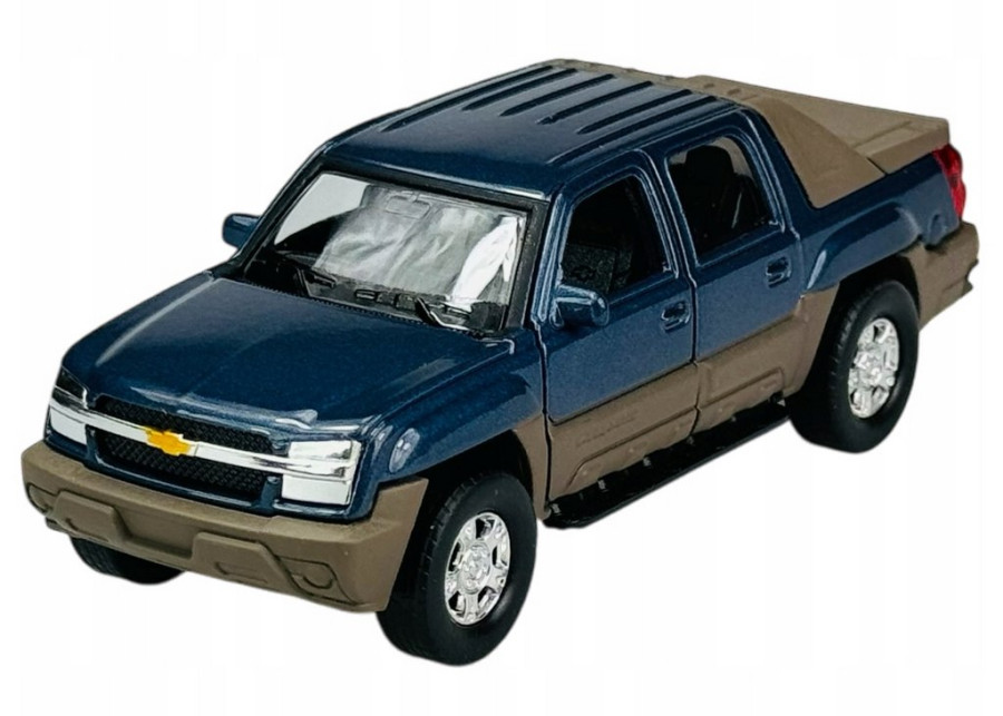 Autíčko Chevrolet ´02 Avalanche v modré barvě v měřítku 1:34-39 značky Welly s plastovým podvozkem a kovovou karoserií.