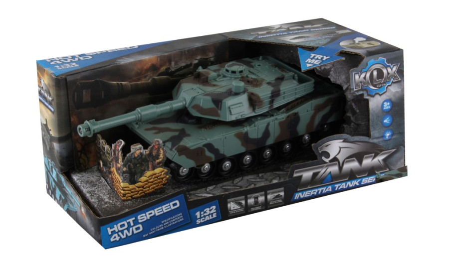 Tank na setrvačník se zvukovými a světelnými efekty. Baterie 3xAG13 jsou součástí balení. Se světlem a zvukem. Na drsném povrchu může stoupat ve 45° úhlu, otáčí se o 360°, hlaveň tanku se hýbe nahoru a dolů.