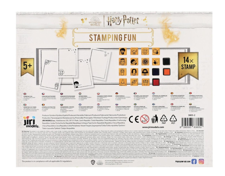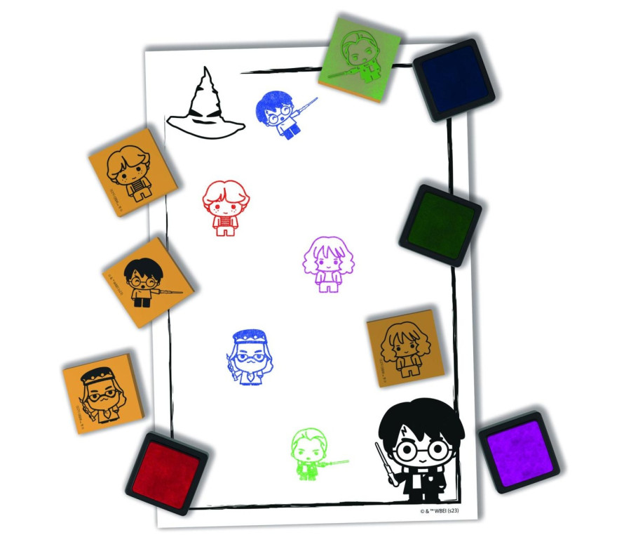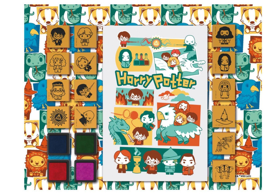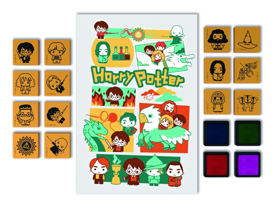 Kreativní sada pro milovníky Harryho Pottera. Set obsahuje 14 pěnových razítek, 4 barevné podušky a blok plný zábavných aktivit k luštění a vyplnění.