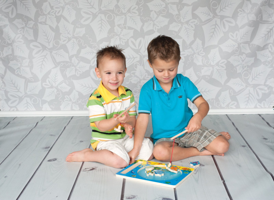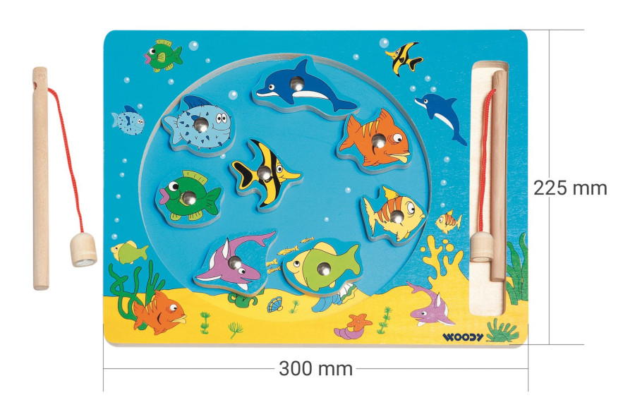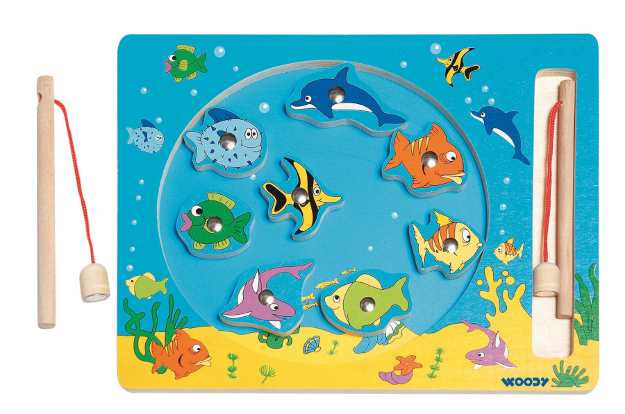 Dřevěný proutek s magnetem zavěšeným na provázku, na který se musí nachytat rybičky. Barevné dřevěné rybičky mají v sobě kovový dílek, za který je ulovíte magnetickou udicí. Hra je vhodná na procvičování motoriky a trpělivosti.