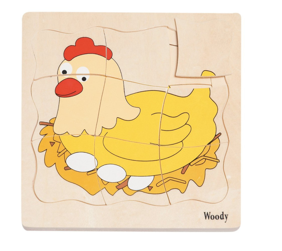 Dřevěné vícevrstvé puzzle. Jednotlivé části je třeba skládat tak, aby vytvořily dno pro další vrstvu. Obrázky zobrazují vývoj slepice od vajíčka až po dospělou slípku.