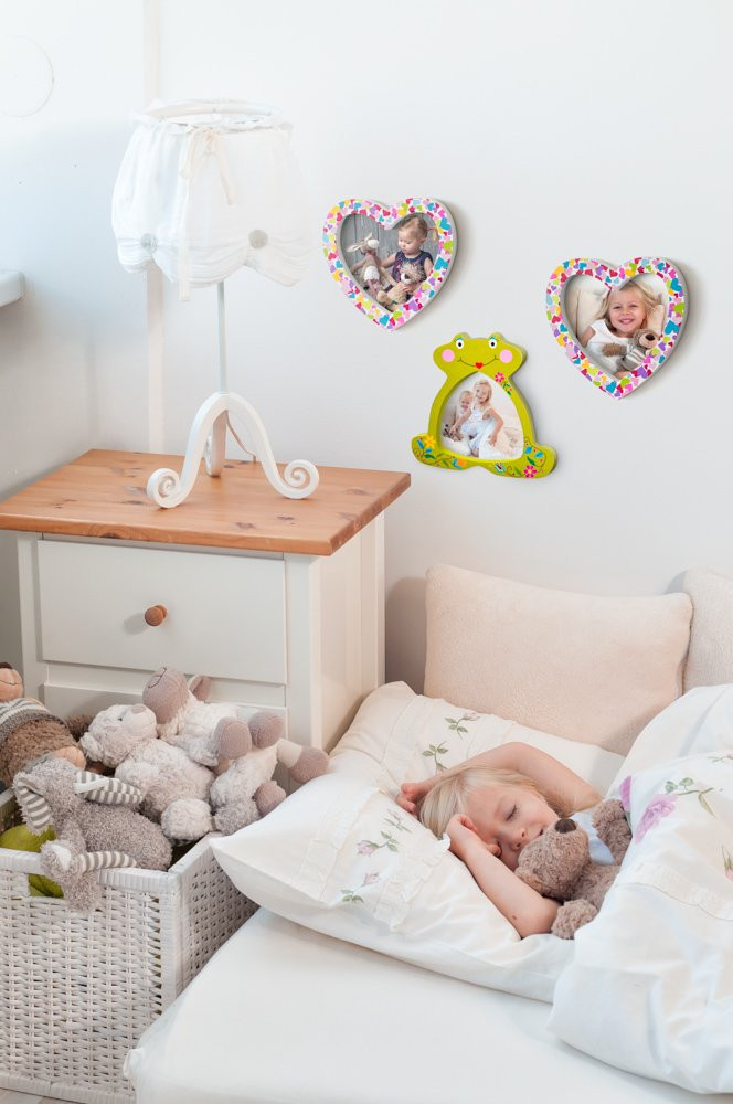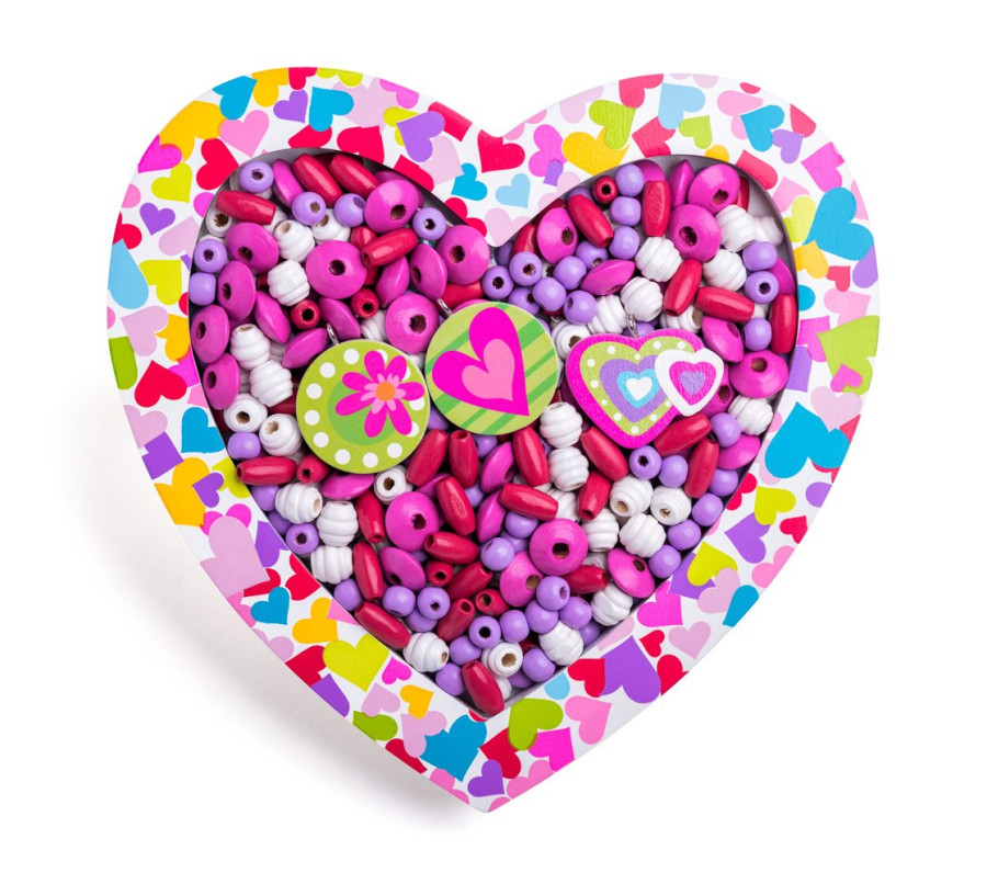 Sada obsahuje: barevné korálky různých tvarů, korálky s motivem květin a srdíček a šňůrky k navlékání. Dřevěné srdíčko, v kterém jsou korálky umístěny, slouží zároveň jako rámeček na fotografii, který je vybaven kováním na zavěšení.