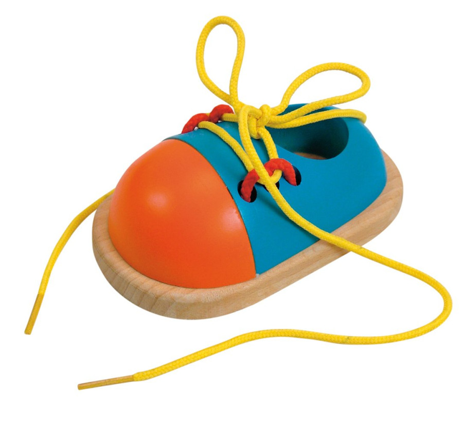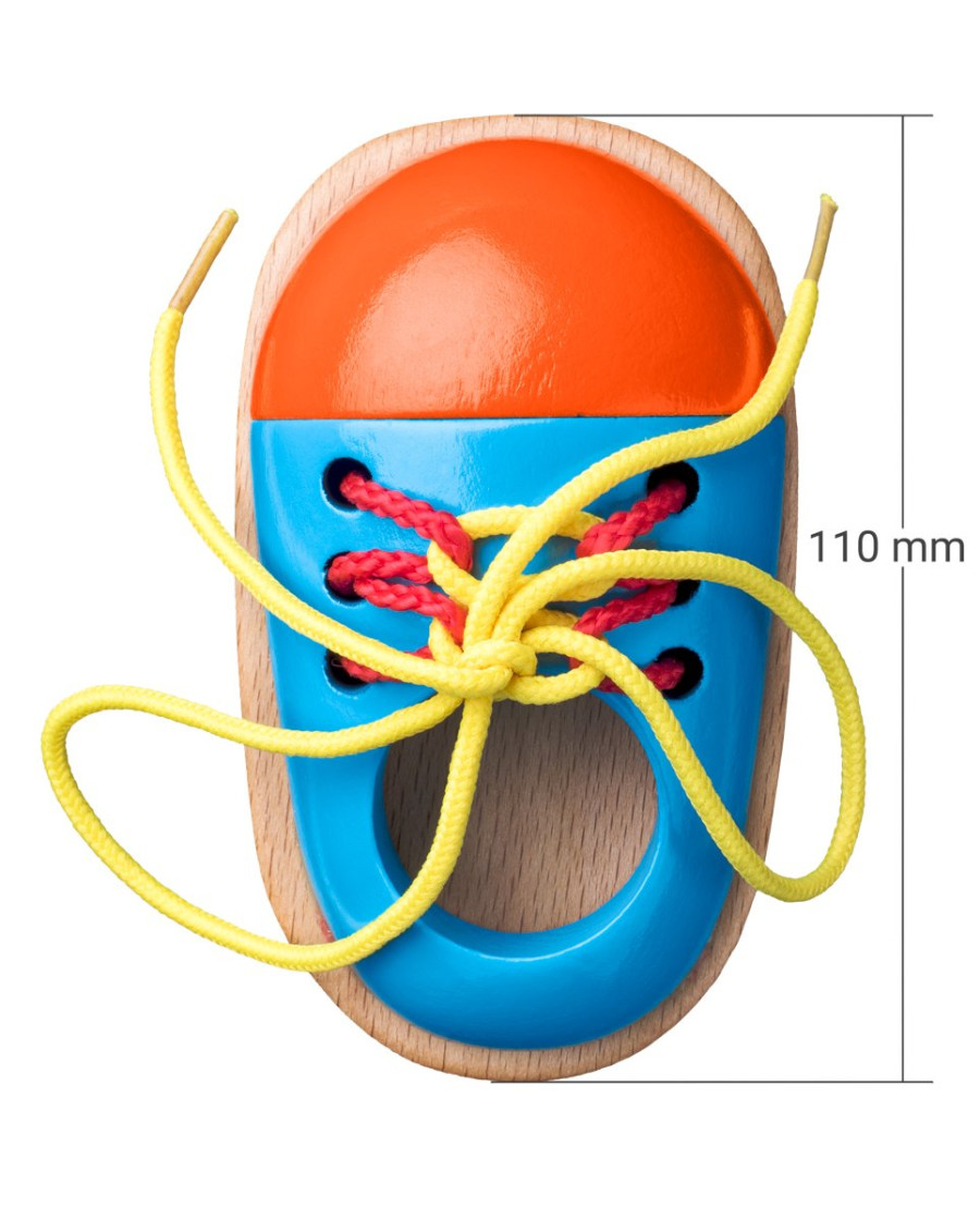 Šněrovací dřevěná botička, na které se dítě učí správně si zavazovat tkaničky. Vhodné pro rozvoj jemné motoriky, trpělivosti a procvičování dané dovednosti.