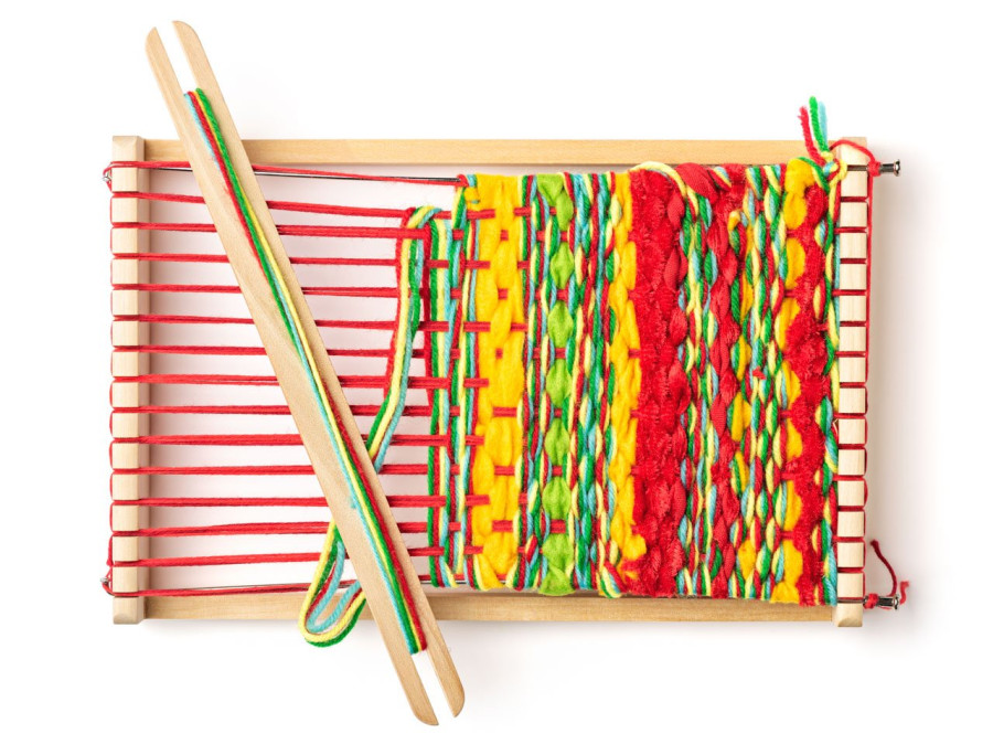 Jednoduchý dřevěný tkalcovský stav je vynikající hračka pro rozvoj manuální zručnosti. Na stav se nejprve napne vlněný provázek a pak již pomocí dvou člunků s namotanou vlnou vzájemně proplétáme skrze napnuté provázky na stavu. A dečka pro panenku je hotová...