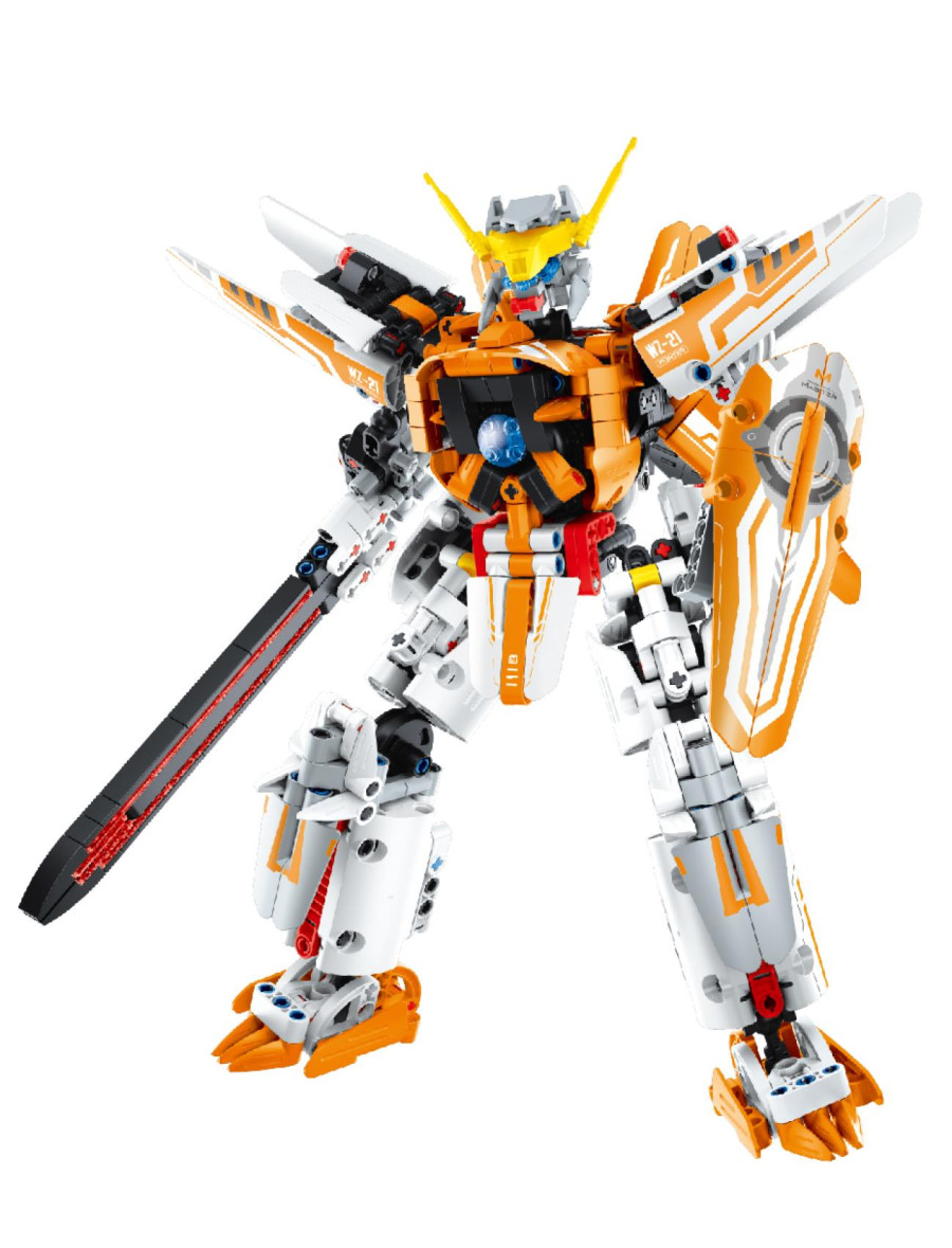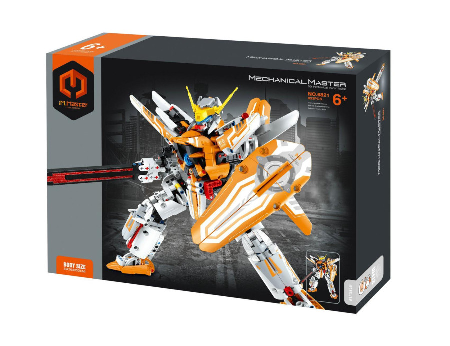 Plastová technická stavebnice vám umožní si sestavi impozantního robota s oranžovo-bílou výzbrojí, dlouhým mečem a masivním štítem.
