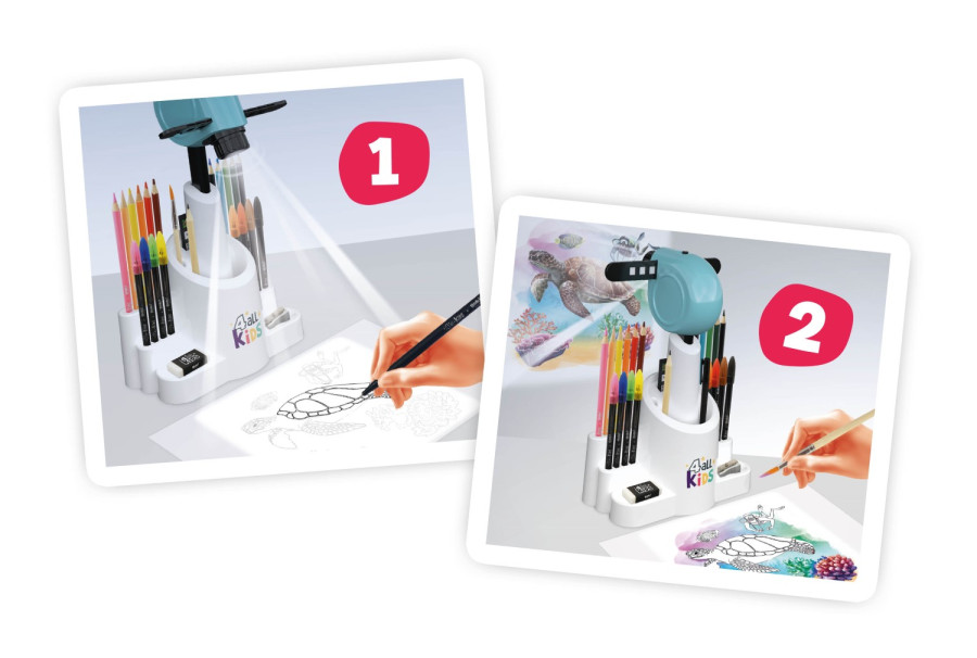Promítněte černobílý obrázek na list papíru, obkreslete jeho obrysy a poté promítněte barevný obrázek, který vám ho pomůže vybarvit.