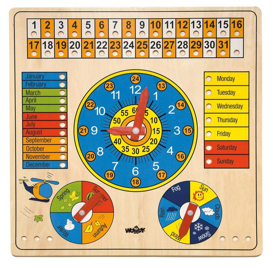 Dřevěný kalendář s českými názvy a hodinami naučí děti pár základních informací. S touto hračkou se dítě učí používat kalendář, kde si ručně nastavuje hodiny, datum, den v týdnu, roční období a počasí.