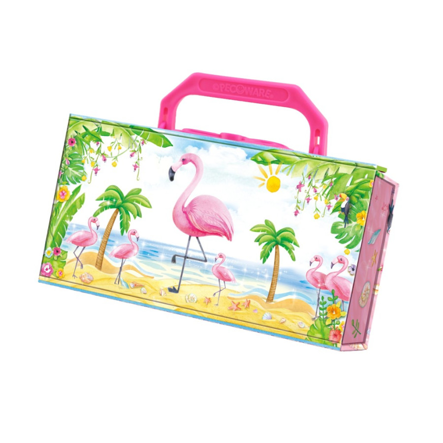 Uložte si své poklady do kufříkové šperkovnice s krásným designem plameňáka. Skvělý doplněk pro malé princezny a parádnice. Výrobek je z pevného, odolného papíru s hladkou povrchovou úpravou.