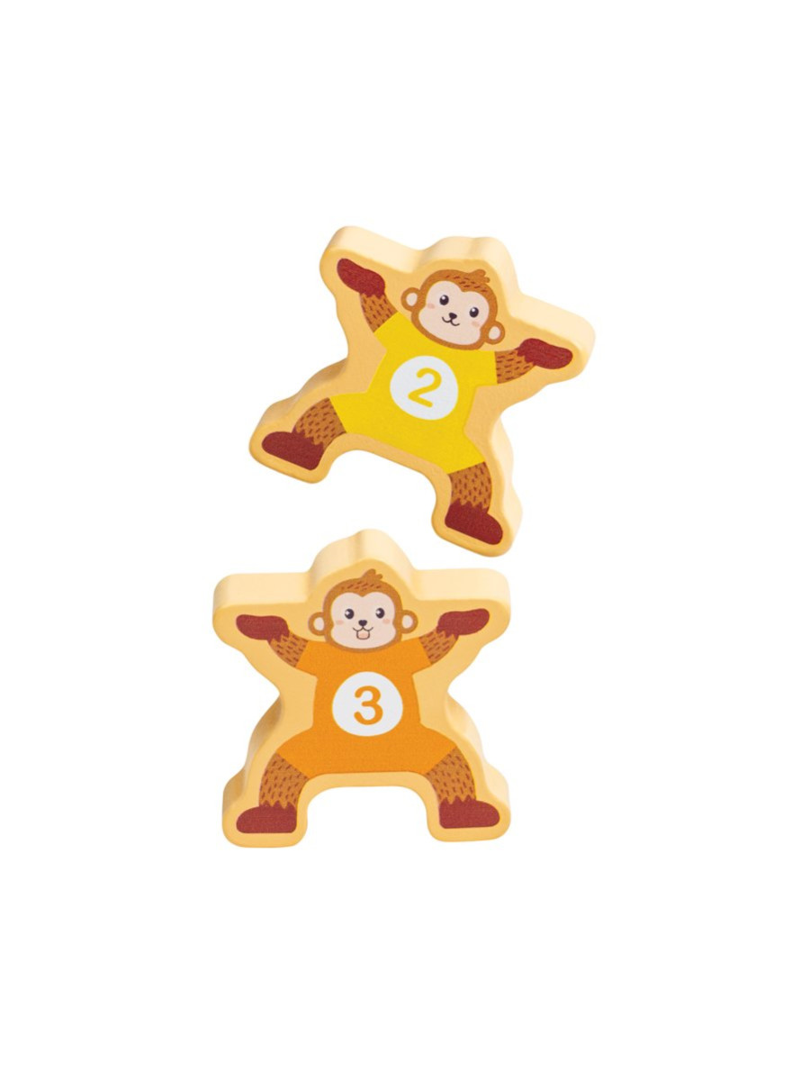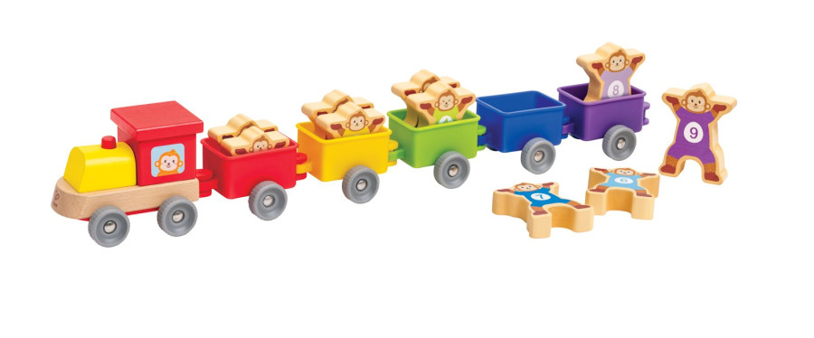 Vláček obsahuje lokomotivu, pět různých barevných oddílů pro vlak a 10 barevných dřevěných opic.