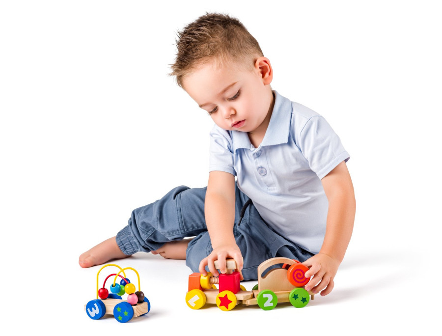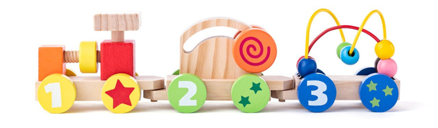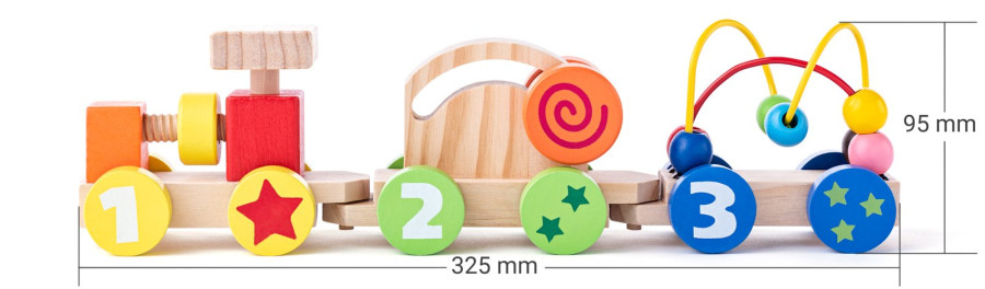 Vláček pro nejmenší nabízí dětem hned několik prvků k procvičení jemné motoriky: šroub na lokomotivě, korálky na drátěné konstrukci, pohyblivé kolečko.