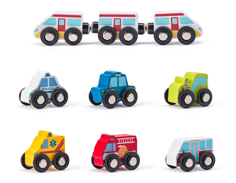 Dřevěný vláček, dřevěná autíčka a kostky pro stavbu domečků tvoří dokonalou herní sadu v jedinečném designu od české výtvarnice.