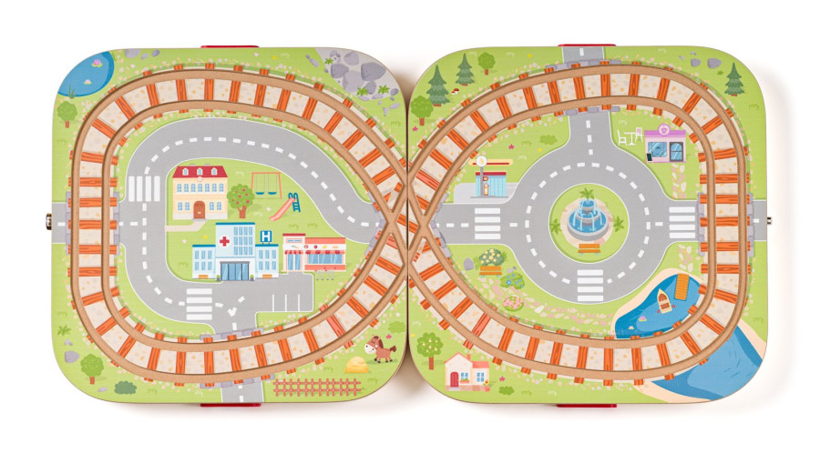 Otevřete kouzelný svět železnic v dřevěném kufříku! Po jeho rozložení vznikne na obou stranách jeho víka krajina s dráhou ve tvaru osmičky s vyfrézovanými kolejemi.