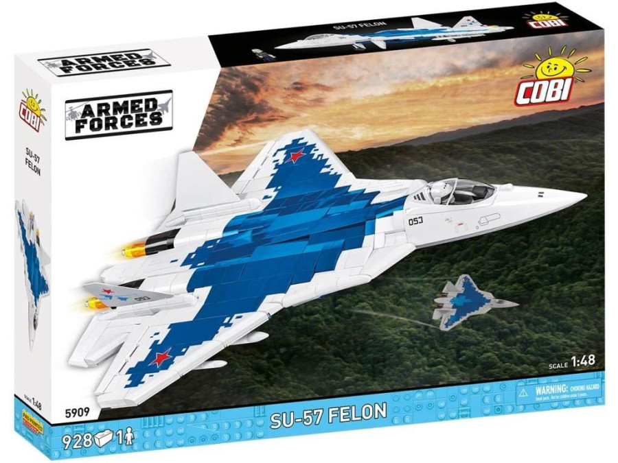 Postavte si model letounu SU-57 Felon ze stavebnice Cobi 5907. Model je v měřítku 1:48 a měří 41 x 9,5 cm a rozpětí křídel má 28,5 cm. Má mnoho funkčních částí. Balení obsahuje 928 kostek stavebnice a figurku pilota.