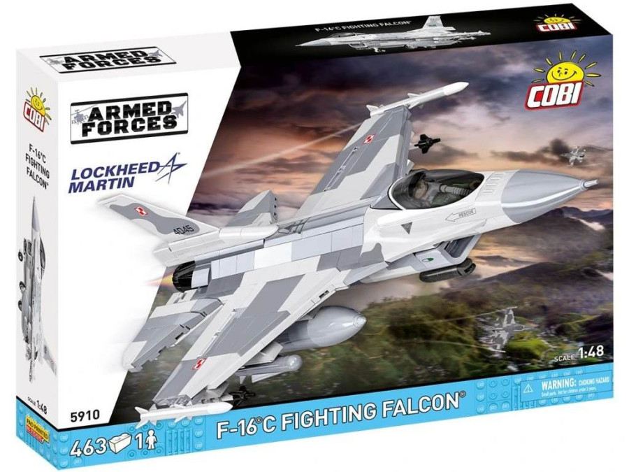 Postavte si model letounu F-16 C Fighting Falcon ze stavebnice Cobi 5910. Model je v měřítku 1:48 a měří 31 x 11,5 cm a rozpětí křídel má 22,5 cm. Má mnoho funkčních částí. Balení obsahuje 463 kostek stavebnice a figurku pilota. Vyrobeno v licenci Lockheed Martin.