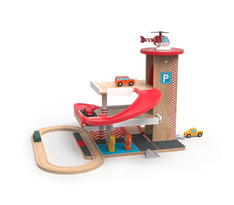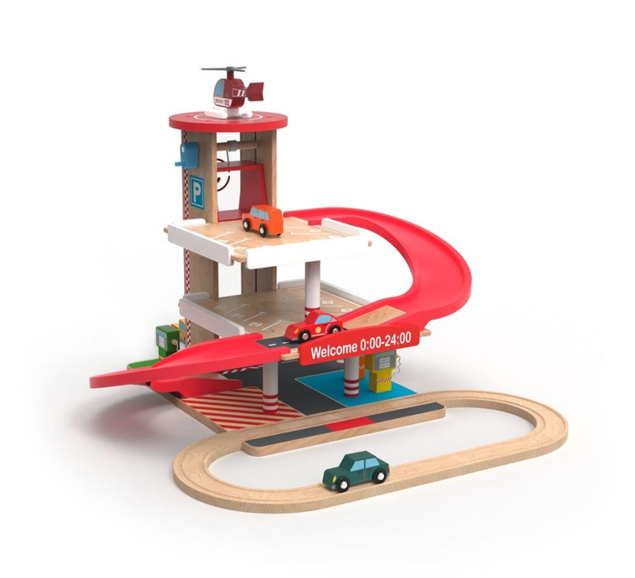 Všem automobilovým nadšencům se rozzáří oči, až uvidí barevnou garáž s výtahem a heliportem. Natankujte ekologicky u stojanu v přízemí. Vyvezte svůj vůz pomocí výtahu s klikovým pohonem a sledujte, jak sviští po rampě dolů a pokračuje dál po dráze.