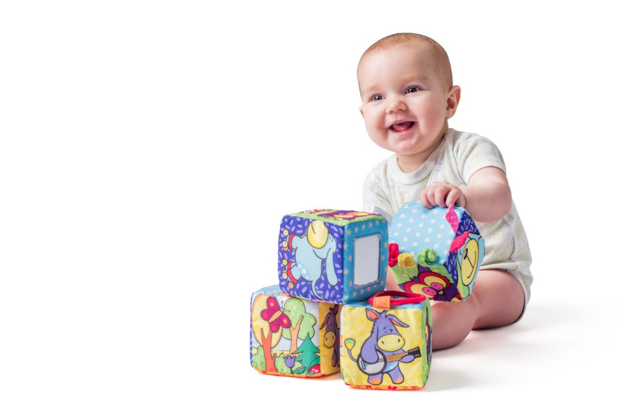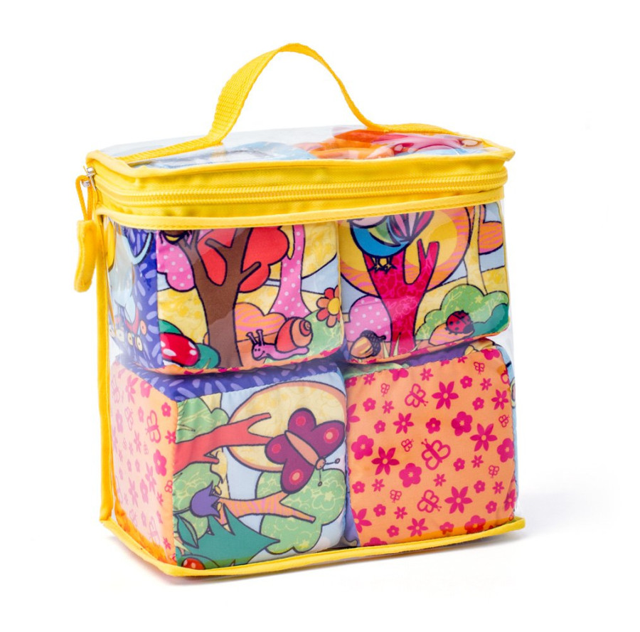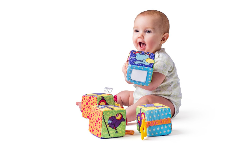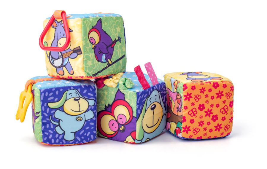 Všechny látkové kostky obsahují různé hrací komponenty: chrastítka, kousátka, pískátka, zrcátko vyrobené z bezpečnostní fólie ve kterém může dítě pozorovat svůj obličej a části vydávající zvuky mačkaného papíru.