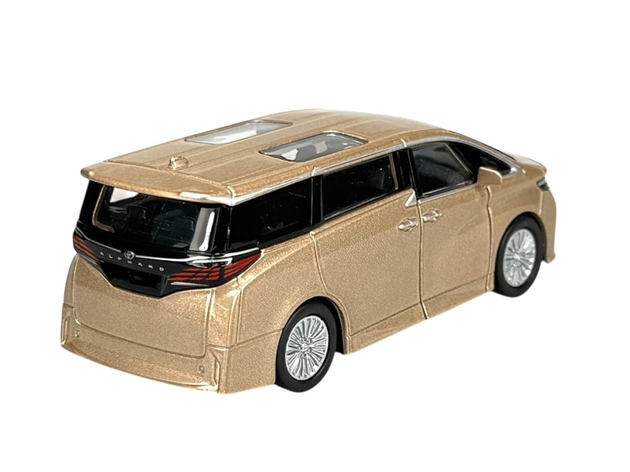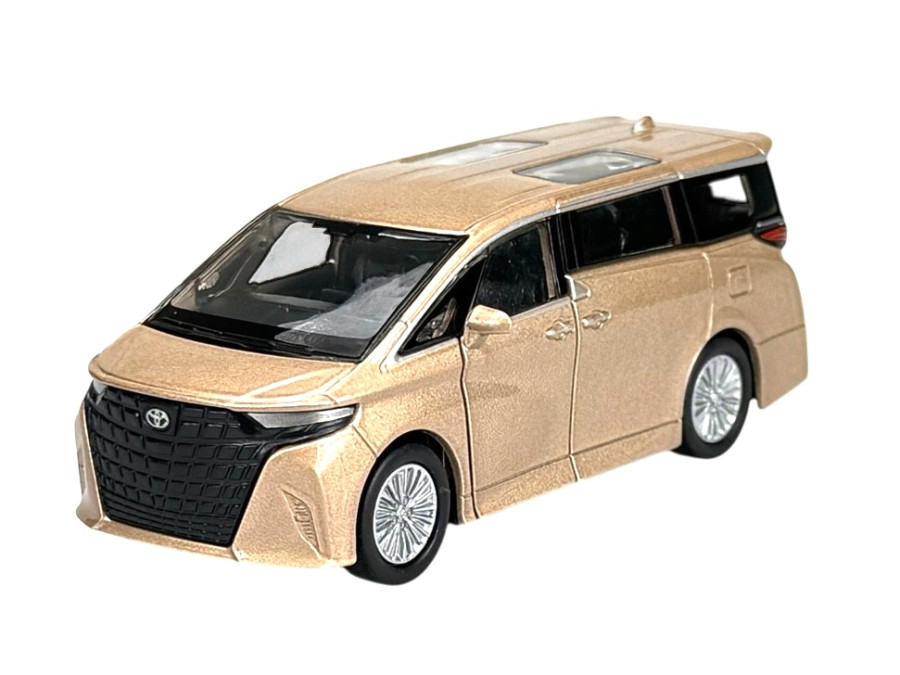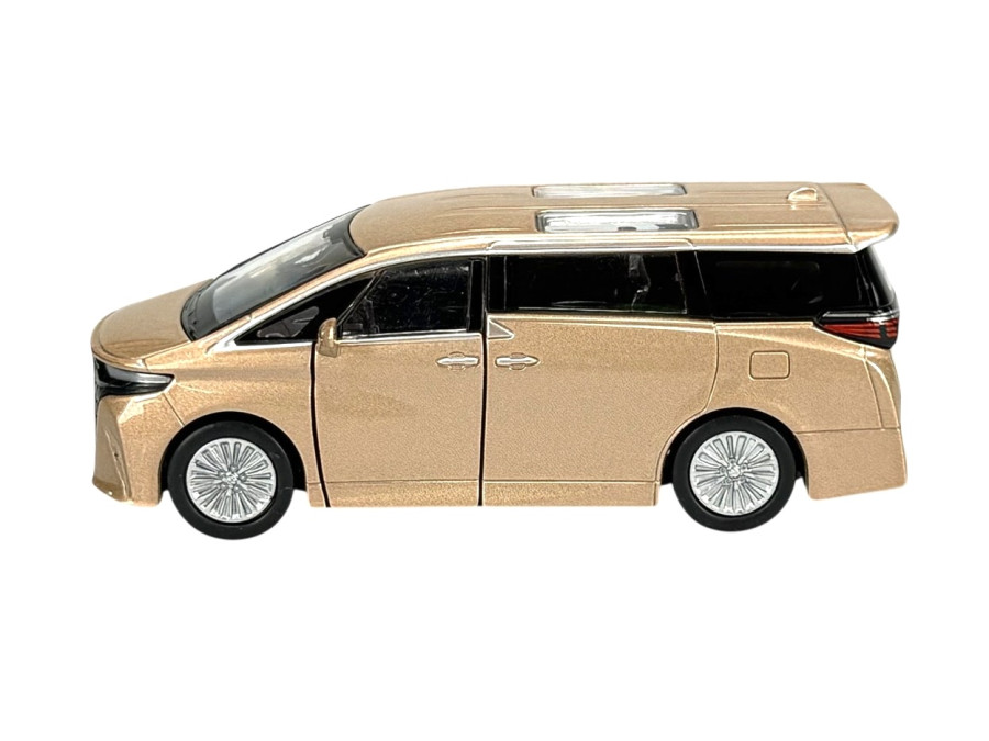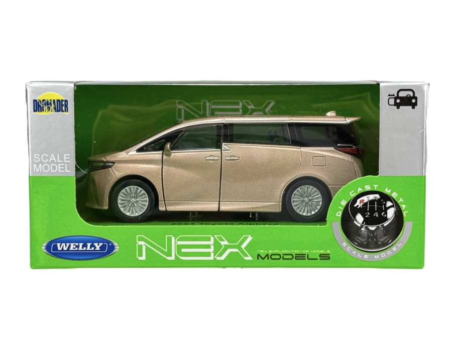 Autíčko Welly Toyota Alphard 2024 ve zlaté barvě. Model autíčka má kovové osy kol a detailní zpracování karoserie včetně interiéru automobilu. Na modelu se otvírají přední dveře.