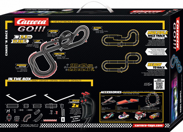 Autodráha Carrera GO!!! dlouhá 5,3m s auty Hypercars, obsahuje křižovatku, rovinky, zatáčky, kolmou stěnu, zúžení dráhy, looping, díl s počítadlem kol a další díly. Můžete si sestavit další různé trati podle své fantazie.