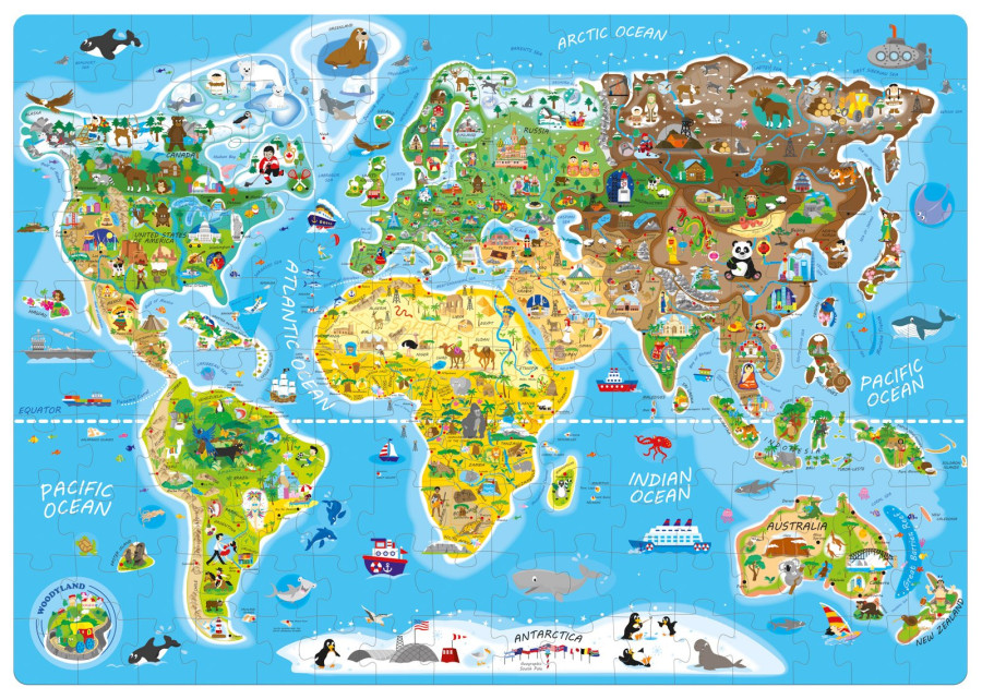 Milujete cestování a skládání puzzle? Pak je tato mapa světa přesně pro vás. Zeměpisné puzzle pro děti s mapou světa a ilustracemi v podobě světových památek a turisty vyhledávaných míst. Puzzle vám pomohou naučit se jaká zvířata v daných oblastech žijí, jaké pamětihodnosti, stavby či přírodní útvary zde naleznou.